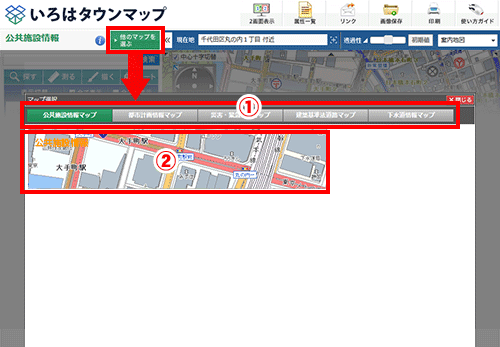 「マップ切替」をクリックし、地図上に表示したいマップを選択します。