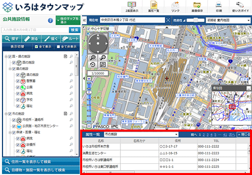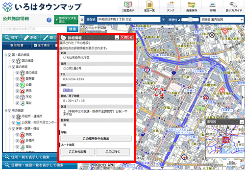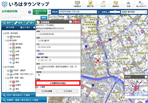 対象の施設をクリックすると、その場所を中心とした地図画面が表示されます。