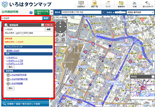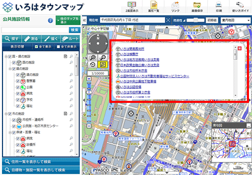 (2)検索文字列に該当する情報の一覧が、地図上の(+)マークを中心として近い情報から20件表示されます。