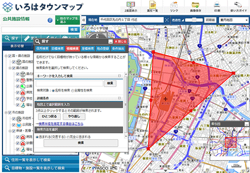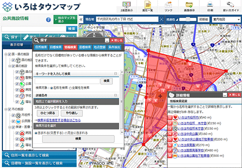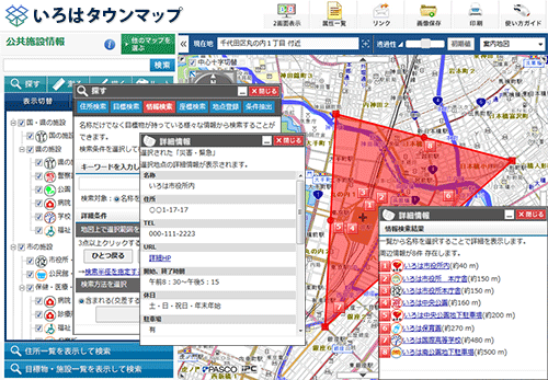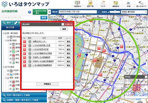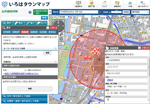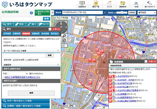 地図上の(+)マークを中心として、指定した半径で対象となる情報を検索することができます。