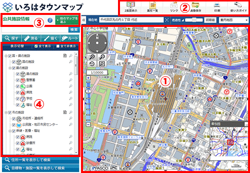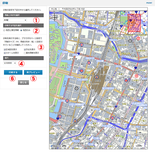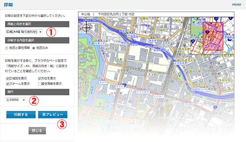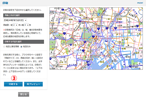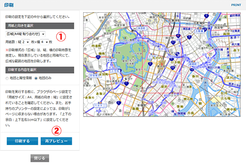 現在表示している地図画面を印刷することができます。[印刷]ボタンをクリックします。