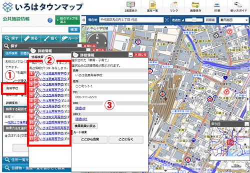 クリックした地点に複数の施設がある場合は吹き出しが表示されるので、その中から施設を選択してください。