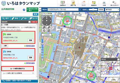 出発地および目的地を選択後、[ルート検索を開始する]ボタンをクリックします。