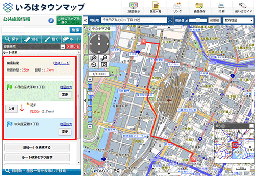 ※「ルート」ボタンをクリックする経路検索地点から該当施設までの経路検索結果が表示されます。
